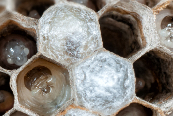 glänzenden Tropfen Nektar an der Zellenwand erkennen. Der kleine Vorrat