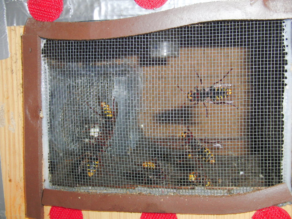 Hornissenkasten an. Ein paar Arbeiterinnen bringen bereits Baumaterial