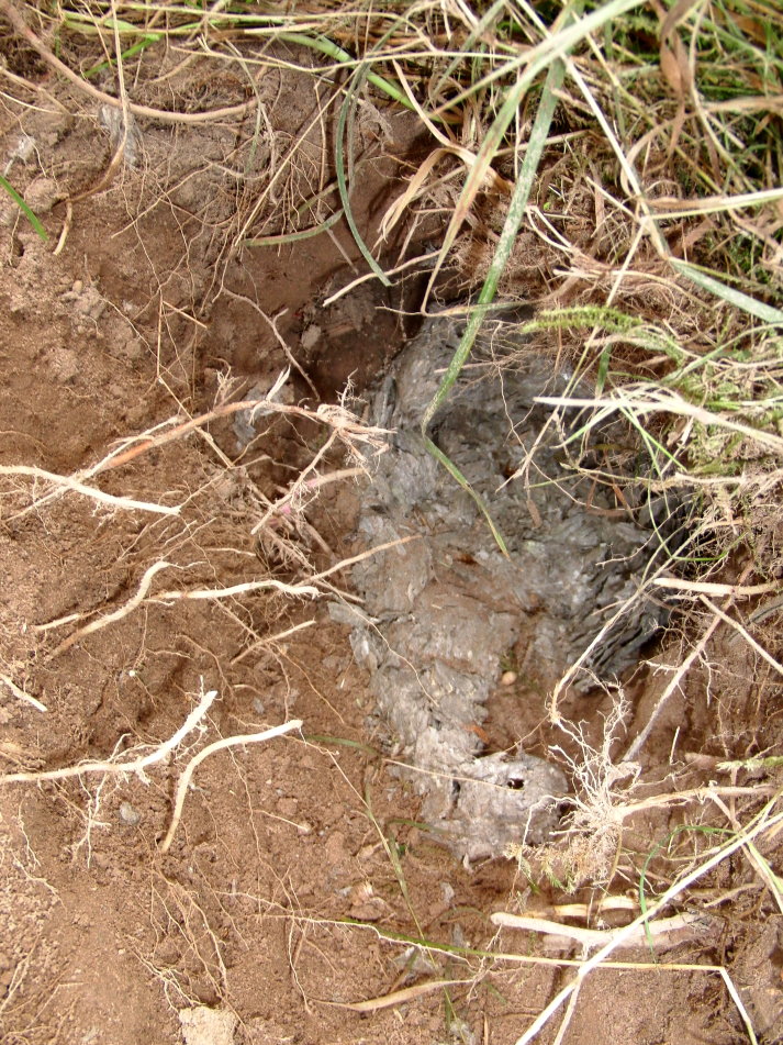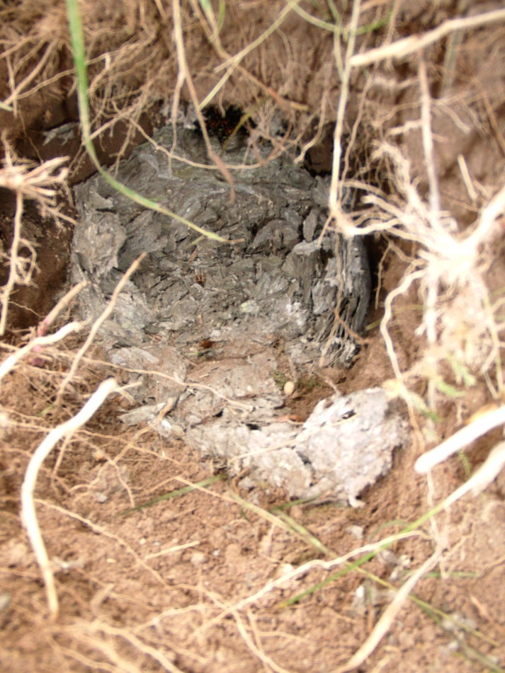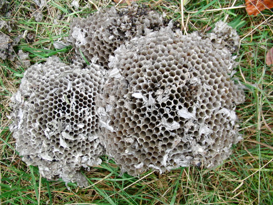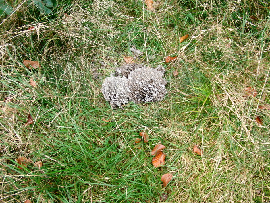 gebliebene Nesthülle aus der Bodenkuhle. Gleich fliegen zwei Rote Wespen