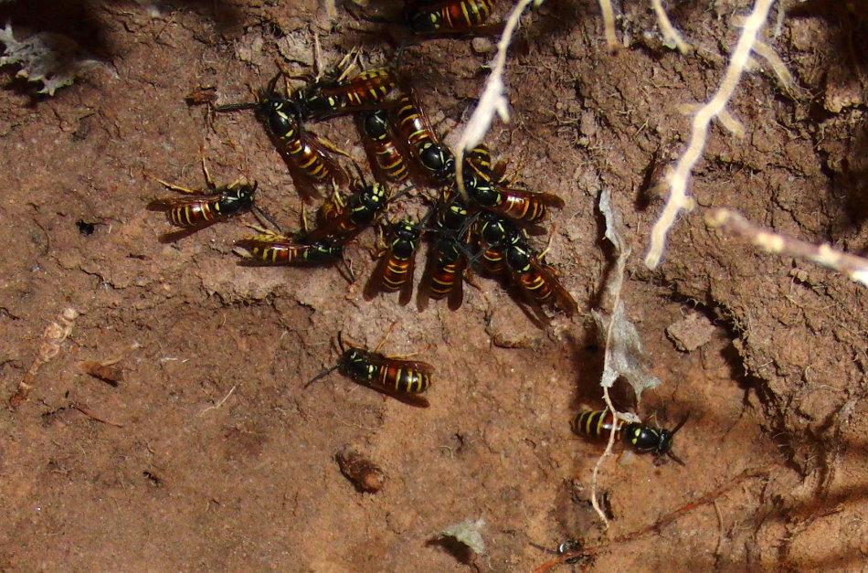 Wespen. Mit der Kamera fotografiere ich in die Erdkuhle. Ich zähle 17