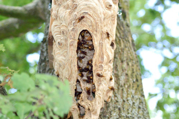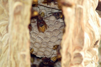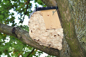 Filiale, wurde das Hornissennest einfach nach außen, vor den Vogelkasten