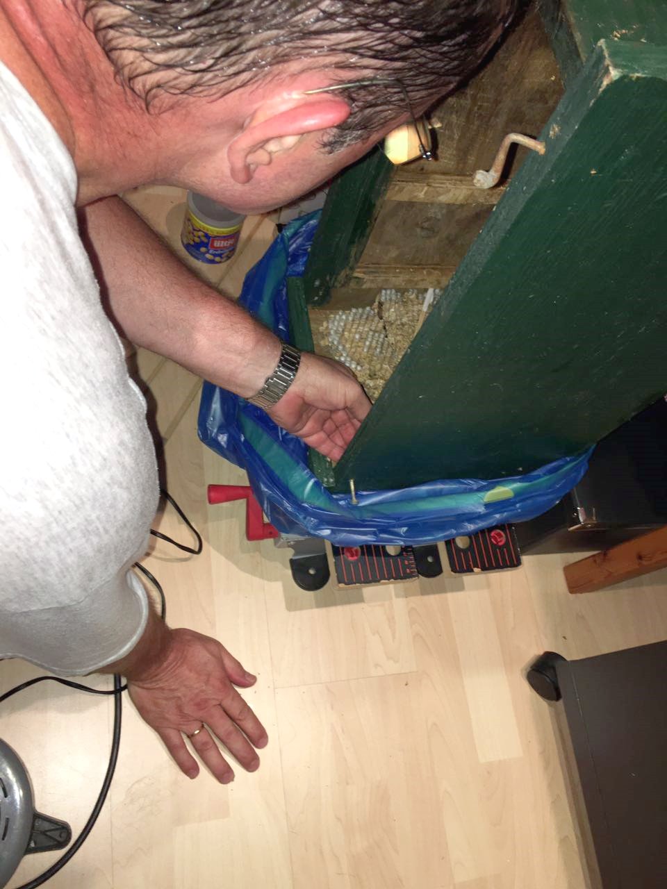 und die Waben ausgebaut. Die unterste Wabe liegt auf dem Boden.