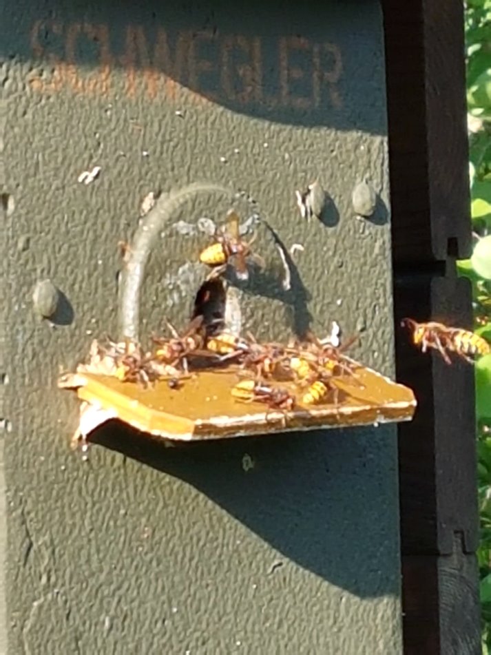 regelrecht ein Gedränge auf dem Flugbrett. Die Hornissen sind ständig