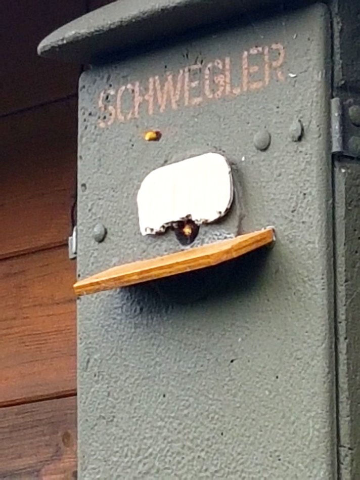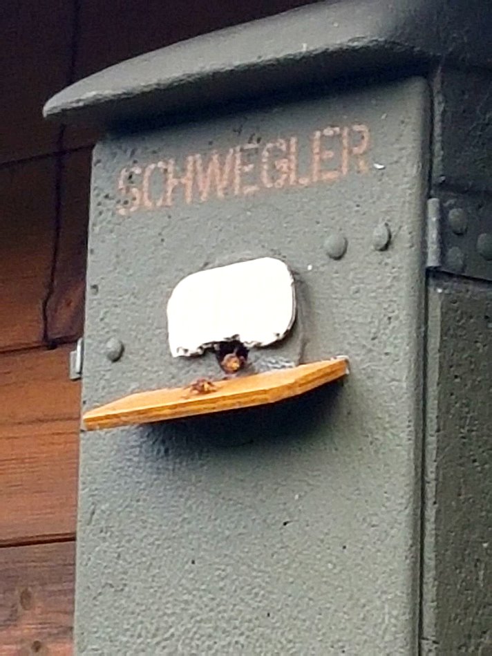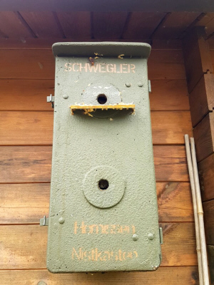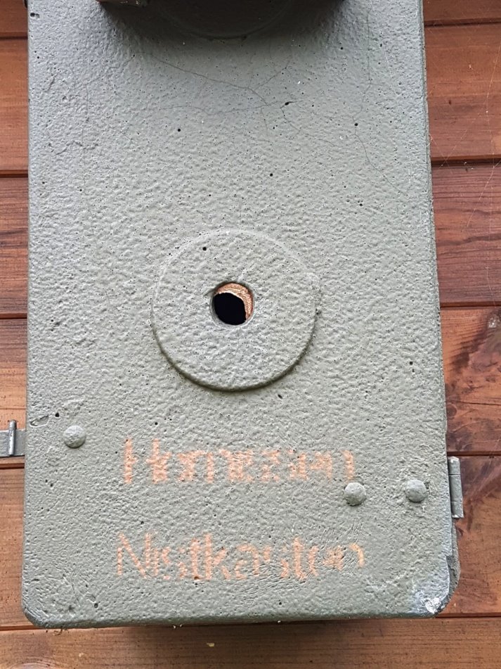 Holzbetonnistkasten der Fa. Schwegler, der am Gartenhaus hängt.