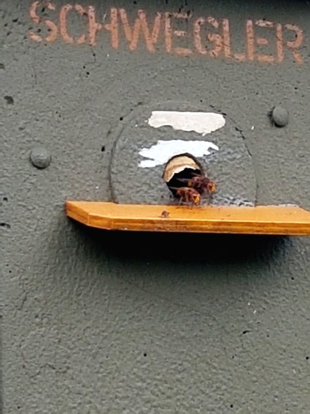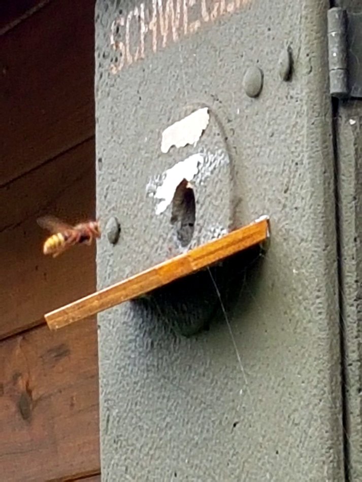 Es herrscht weiterhin reger Flugverkehr am Eingang zum Hornissennest.