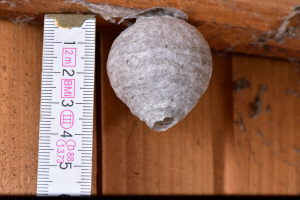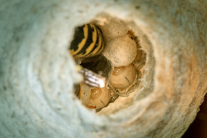 Arbeiterinnen, die Larven der Kuckuckswespe groß. Das Nest wird nicht