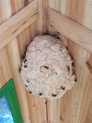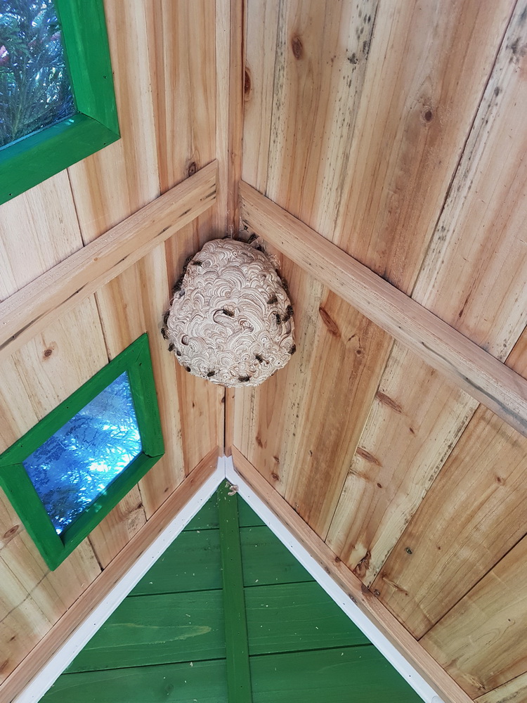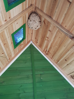 Nest der gemeinen Wespe in einem Kinderspielhaus.
