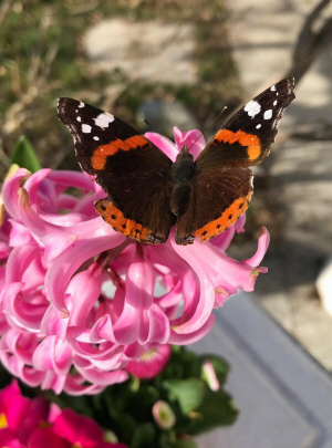 Ein Admiral stärkt sich an einer Hyazinthe