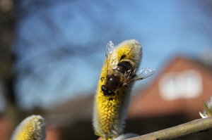 Eine Keilfleckschwebfliege sammel Nektar an der Weide ...