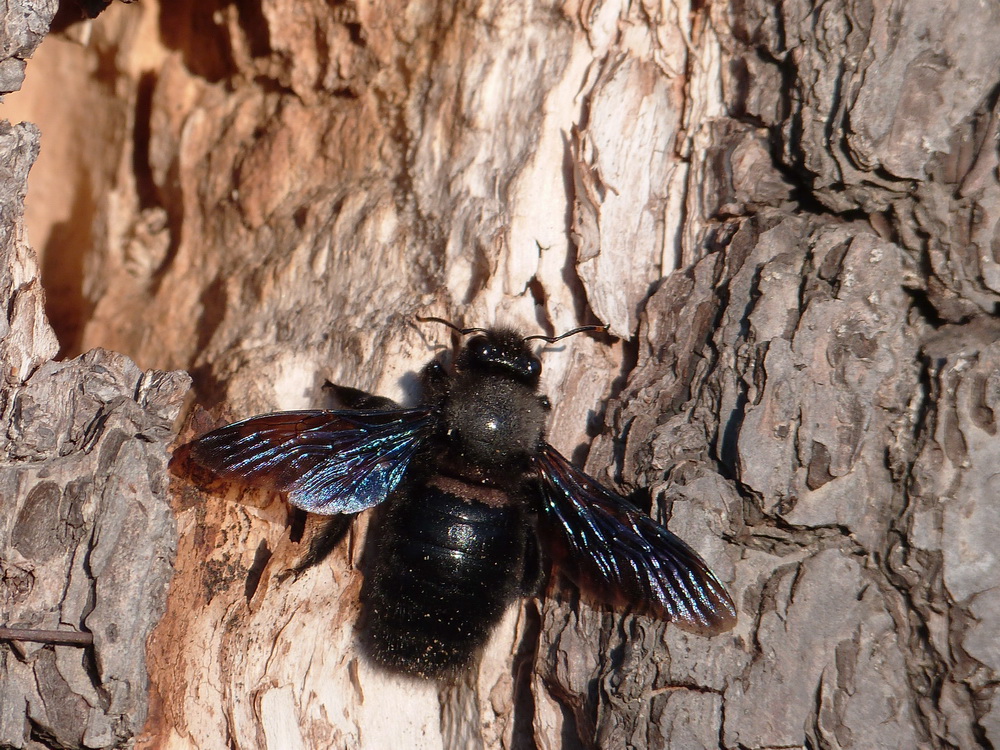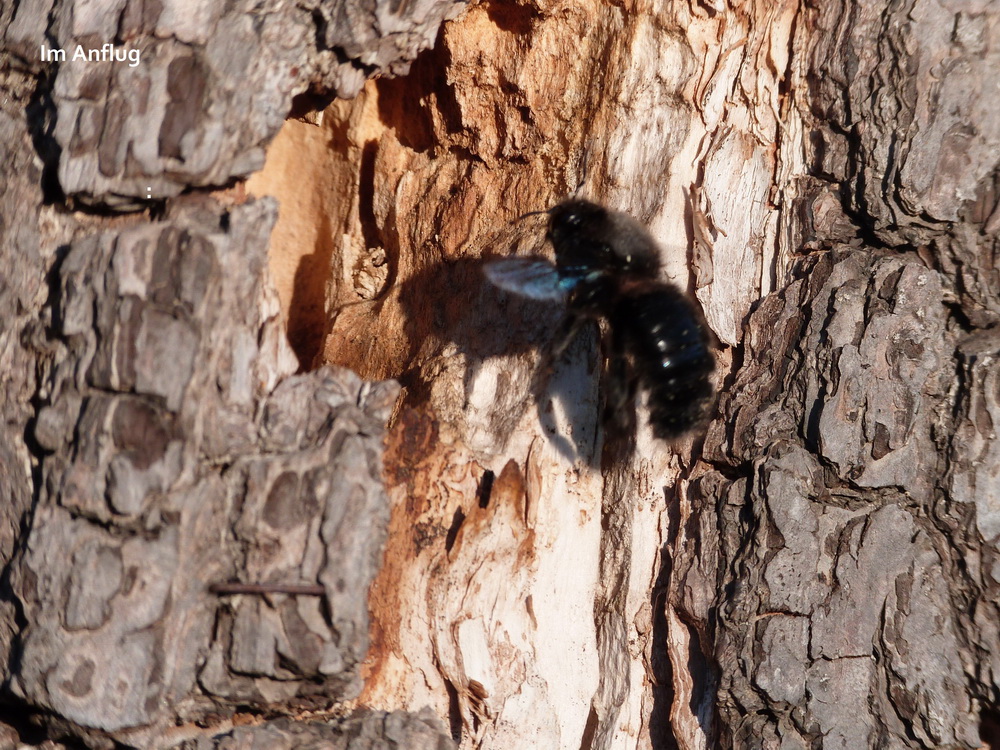 Ein Männchen der Blauen Holzbiene untersucht das Loch im morschen