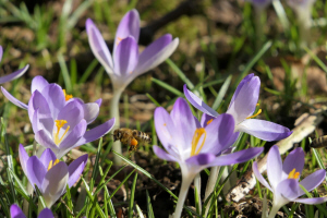Honigbienen sammeln den ersten Nektar auf den Frühlingsblühern.