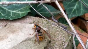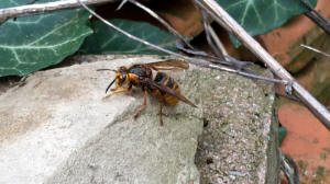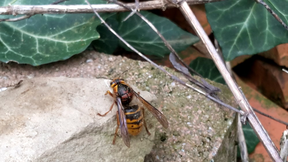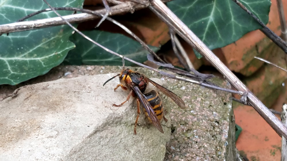 Wespenkönigin aus einem Steinhaufen hervor. Träge putzt sie sich und