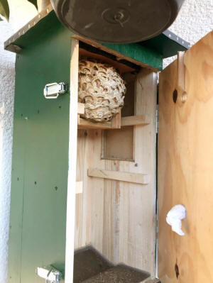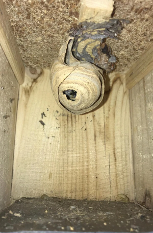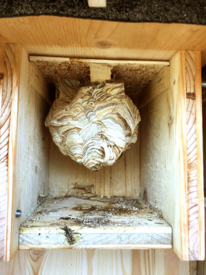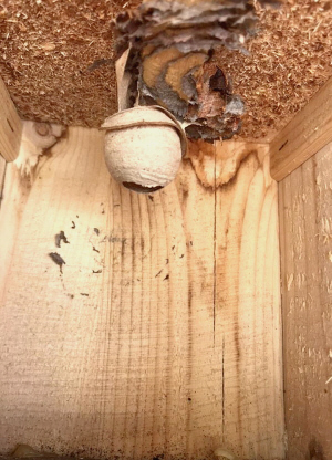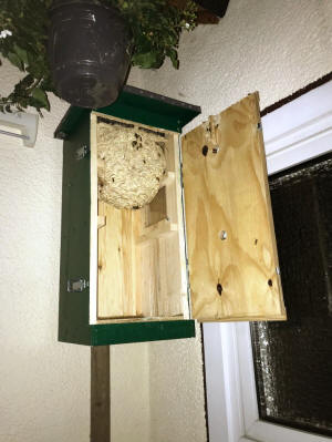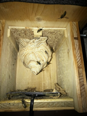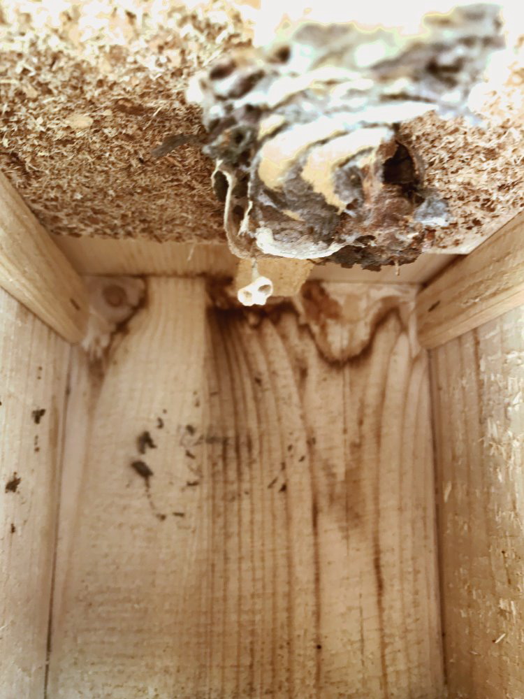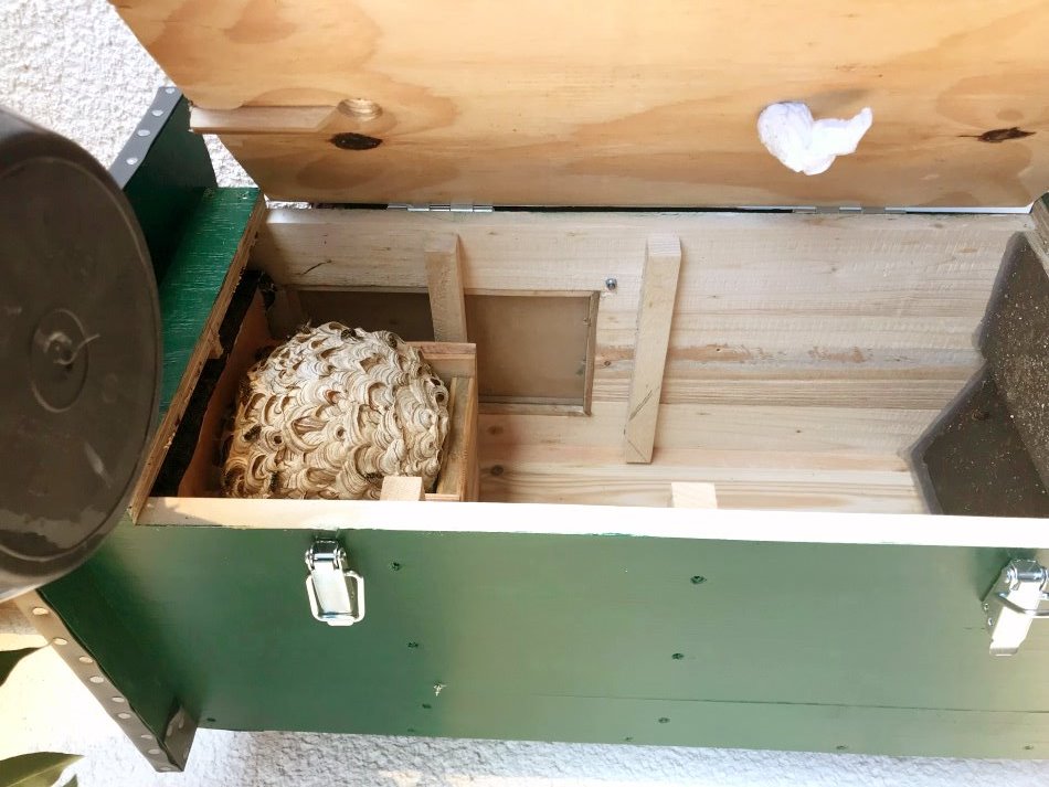 Die Wespen bauen ihre Nesthülle nun um den Lockkasten herum.