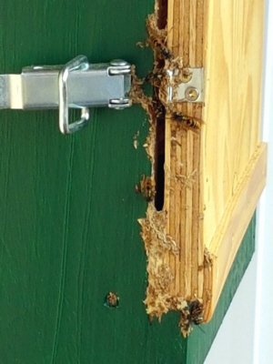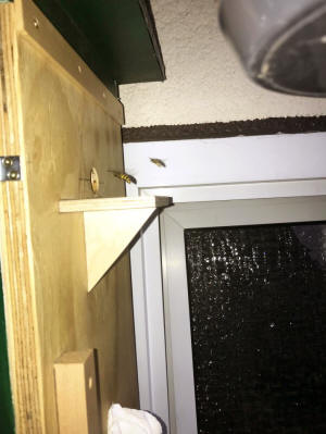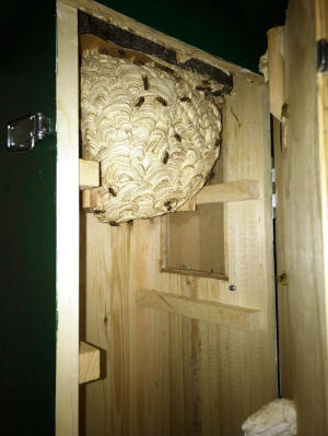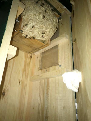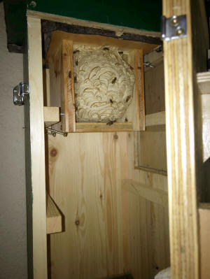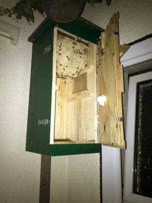 Das Wespennest wird zu groß und dockt bereits an der Kastentür an. Beim