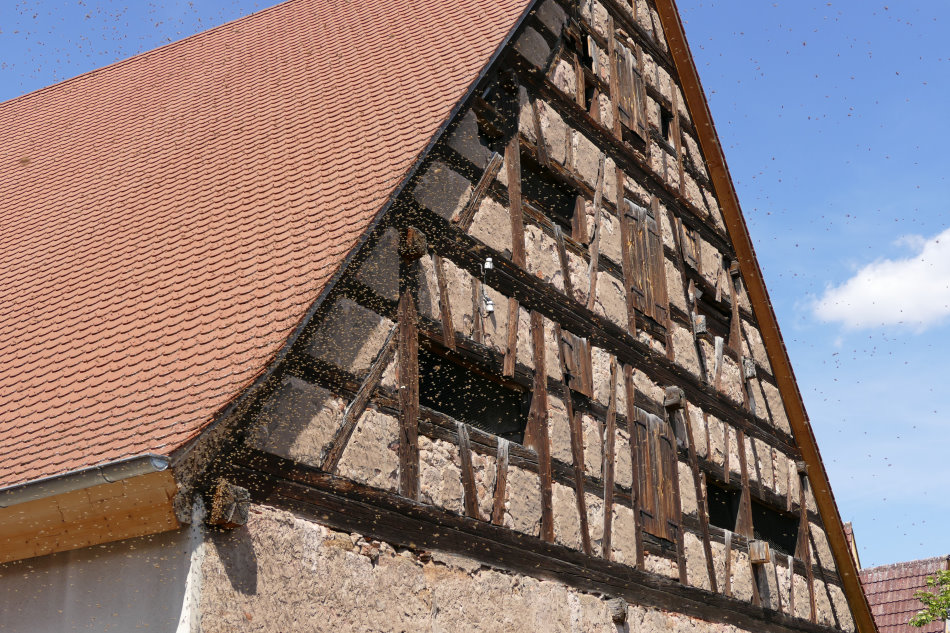 Welch imposante Beobachtung: Ein riesiger Bienenschwarm fliegt durch die Luft und sammelt sich langsam an der Fassade eines Fachwerkhauses.
