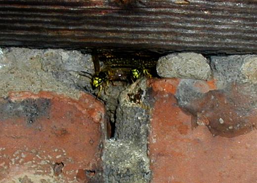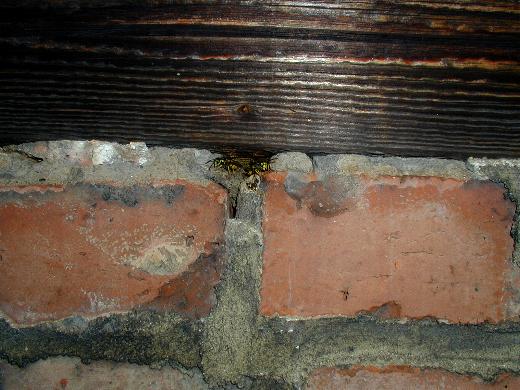 Typisch für die Dunkelhöhlennister, entdeckte hier die Königin der deutschen Wespe im Frühjahr, einen Einschluppf über die offene Fuge der Backsteinwand, in die Zwischendecke eines Anbaus.
