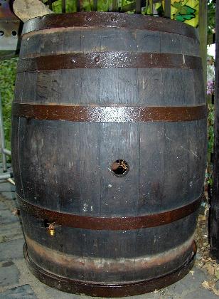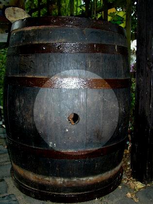 Bei Familie R. befindet sich im naturbelassenen Garten, unter der Pergola, ein altes, ausrangiertes Weinfass. Es dient hier als kleine Abstellfläche für Feierlichkeiten oder einem gemütlichen Beisammensein mit der Familie.