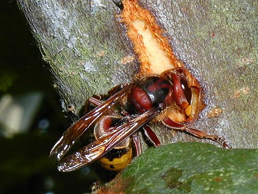 Unter Ringeln versteht man, das von der Hornisse, mit den Mandibeln vorgenommene Aufbeißen der Rinde. Gerade an jungen Ästen von Gehölzen, werden die unter der Rinde verlaufenden Saftbahnen angezapft. Am auslaufenden Pflanzensaft stillt die Hornisse ihr Verlangen auf kohlehydrathaltige Säfte. Besonders im Spätsommer und Herbst, wenn andere Saftquellen langsam versiegen, werden gerne die Saftbahnen von Gehölzen angezapft. Die Rindenverletzungen verwachsen wieder und hinterlassen keinen bleibenden Schaden an der Pflanze.