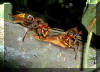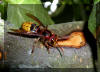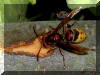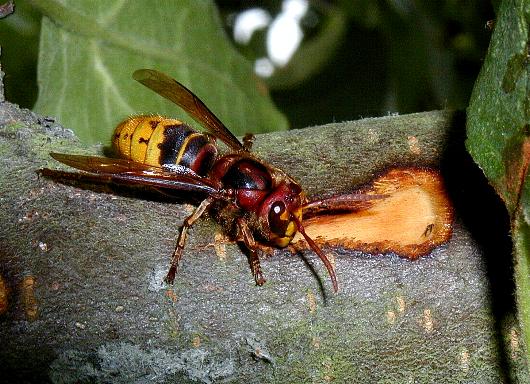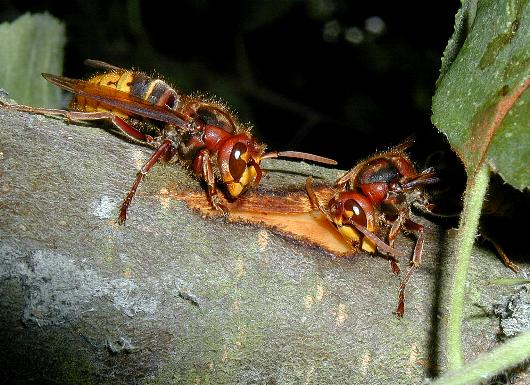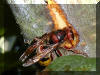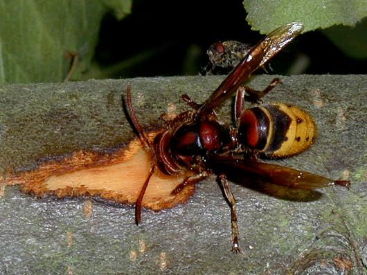 Auf Bild 1 kann man deutlich hinter der Hornisse eine Fliege erkennen, die auf das Freiwerden der Saftquelle wartet. Wird sie zu unvorsichtig, endet die Fliege als Beute im Hornissennest. |