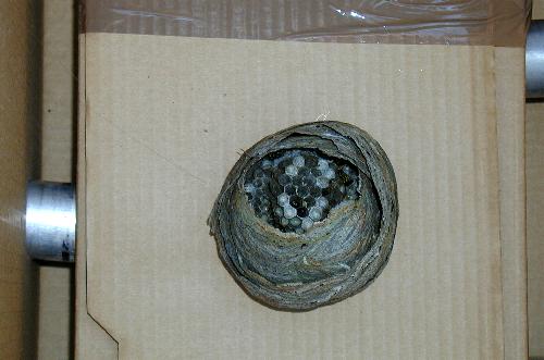 Nest am Schuppeneingang Vergrößerung des Nestes Bereitstellen der Ausrüstung Eingeklebtes Wespennest nach der Entnahme Wabenbau mit zwei Etagen |