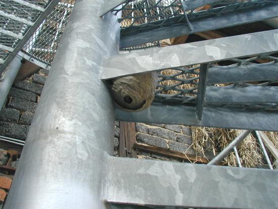 Gerade an einer Wendeltreppe aus Stahl, im Außenbereich eines Zweifamilienhauses, hatte sich ein Nest der mittleren Wespe angesiedelt.