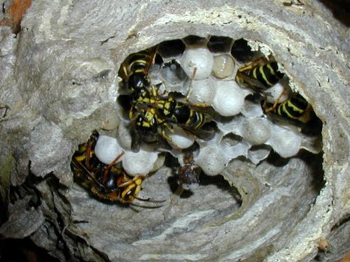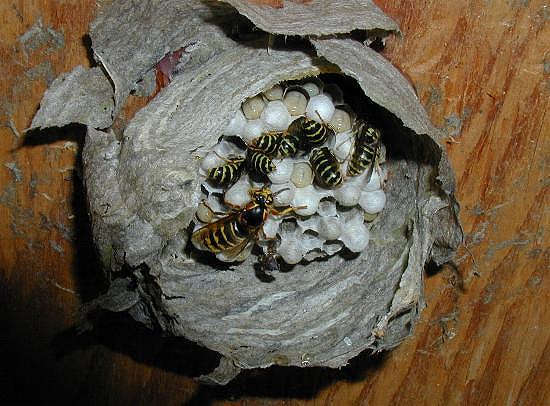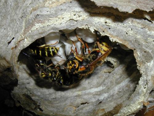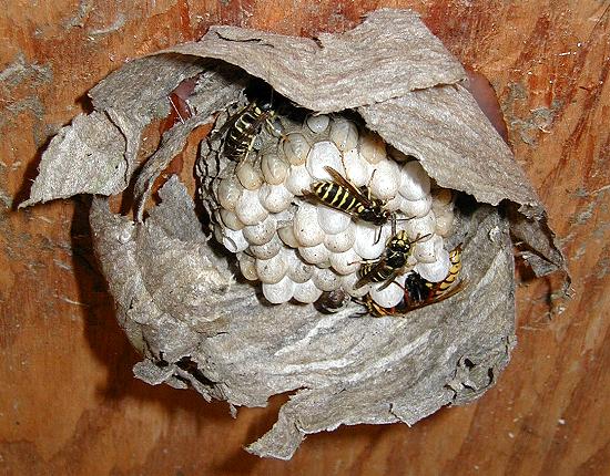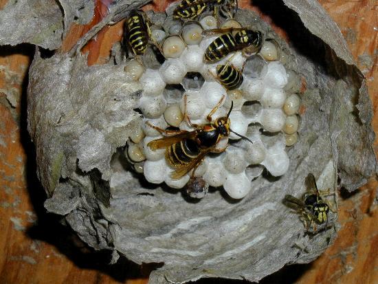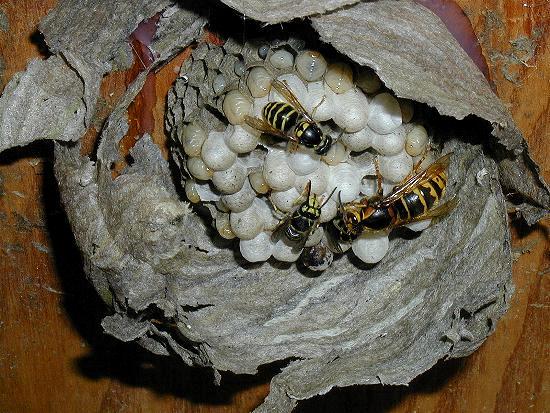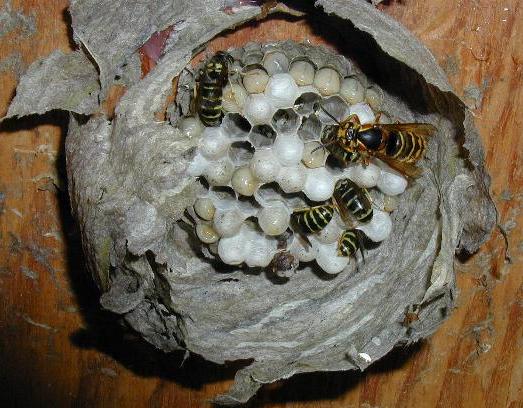 Im Umsiedlungskasten hängt jetzt ein etwa Apfelsinengroßes Wespennest. Ungefähr 10 Arbeiterinnen kümmern sich um Brutpflege, Königin und Nest- und Wabenbau. Nest und Staat werden sich in den nächsten Wochen um einiges vergrößern.
