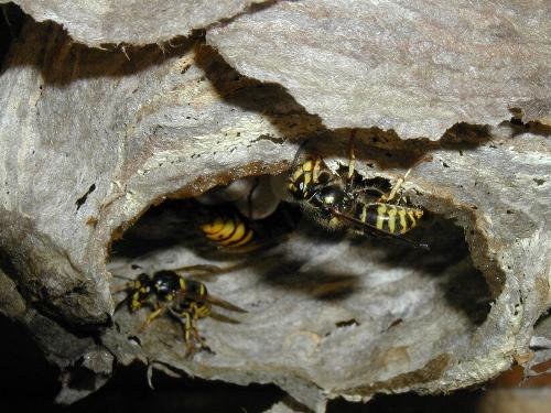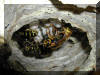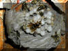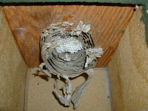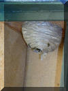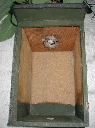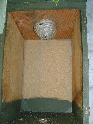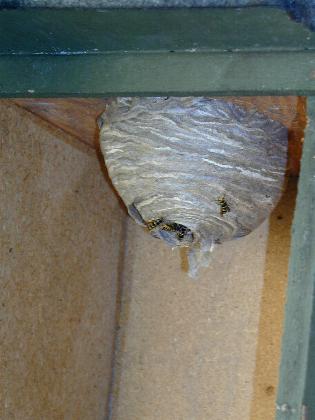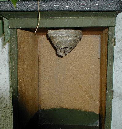 15.08.03 Eine einzige Wespe lässt sich ab und zu am Einflug sehen. Die Saison scheint für dieses Nest zu Ende zu sein.