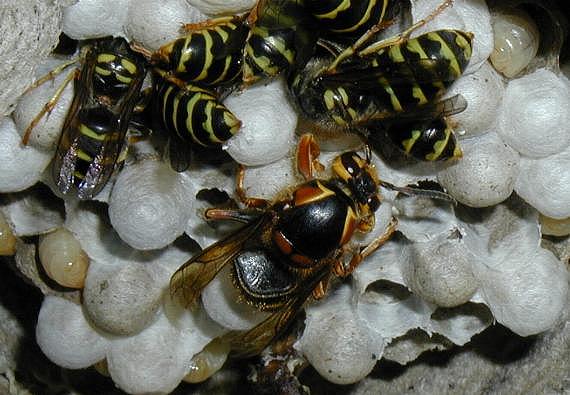 Tag 5 letzter Einblick in das noch offene Nest. Brutpflege, Verpflegung des Nestes und Nestbau beherrschen den Alltag. Kommt eine Arbeiterin mit Beute, wird diese unter den Arbeiterinnen verteilt ("Trophollaxis"). Auch die Königin bekommt ihren Anteil. Durch die Eiweißhaltige Kost wird die Eierproduktion stimuliert.