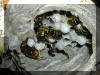 Tag 4 die Nesthülle (links oben) beginnt sich langsam zu schließen. Arbeiterinnen tragen defekte Hüllenteile ab und verbauen sie zu neuen Wabenzellen. Die Brutpflege beherrscht den Alltag im Nest. Leere Brutzellen werden von der Königin neu bestiftet.