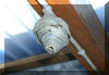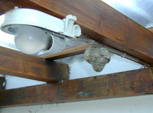 Gerade bei einer Wespenstich-Allergikerin (Allergiepass und Notfallset vorhanden), hatte sich die mittlere Wespe unter dem Pergoladach des Gewächshauses niedergelassen. Unmittelbar unter dem Nest, in Kopfhöhe, befand sich die Arbeitsplatte der Hobbygärtnerin.