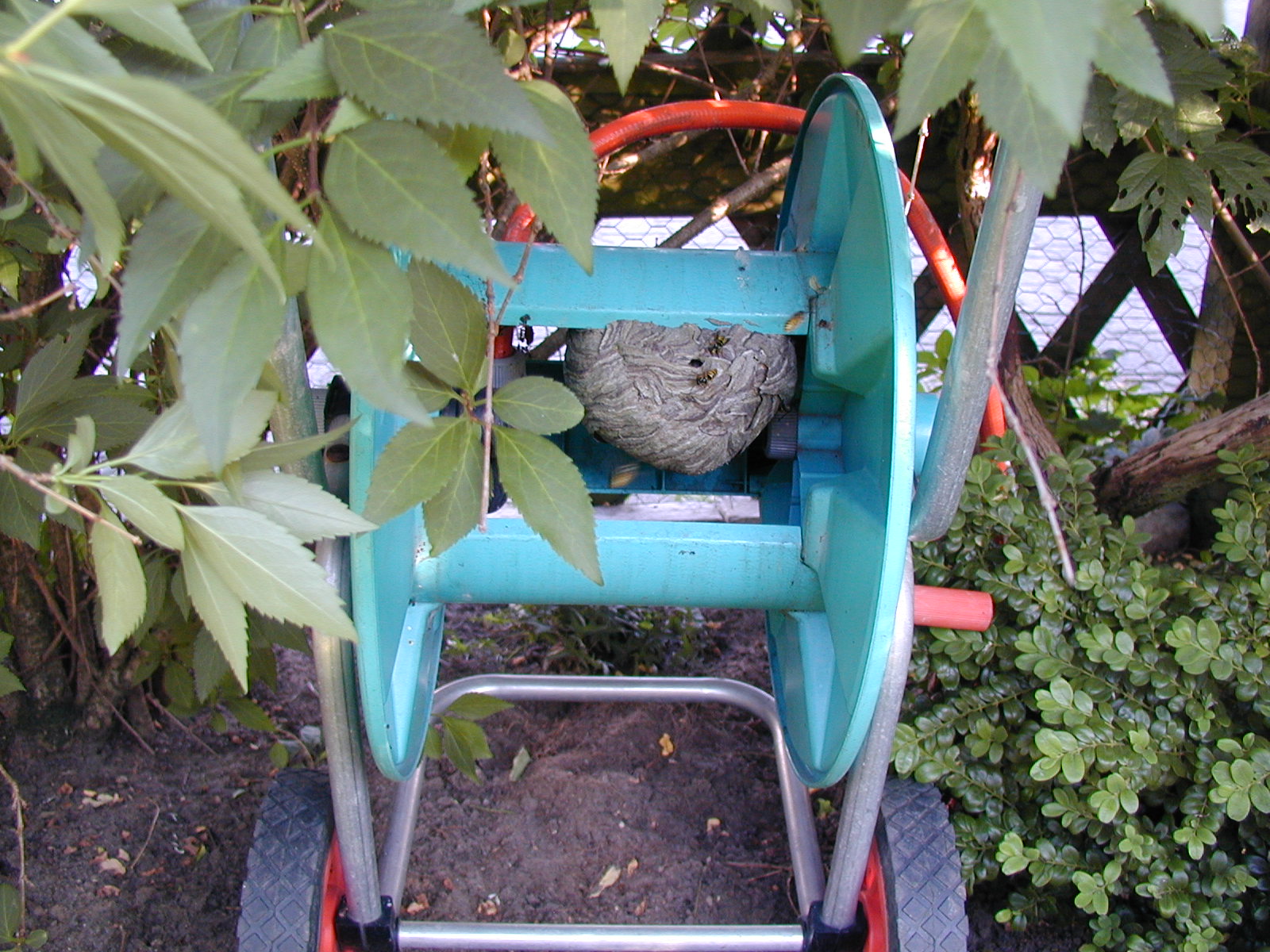 Abrollen des Gartenschlauches entdeckte Herr M. dieses Wespennest in