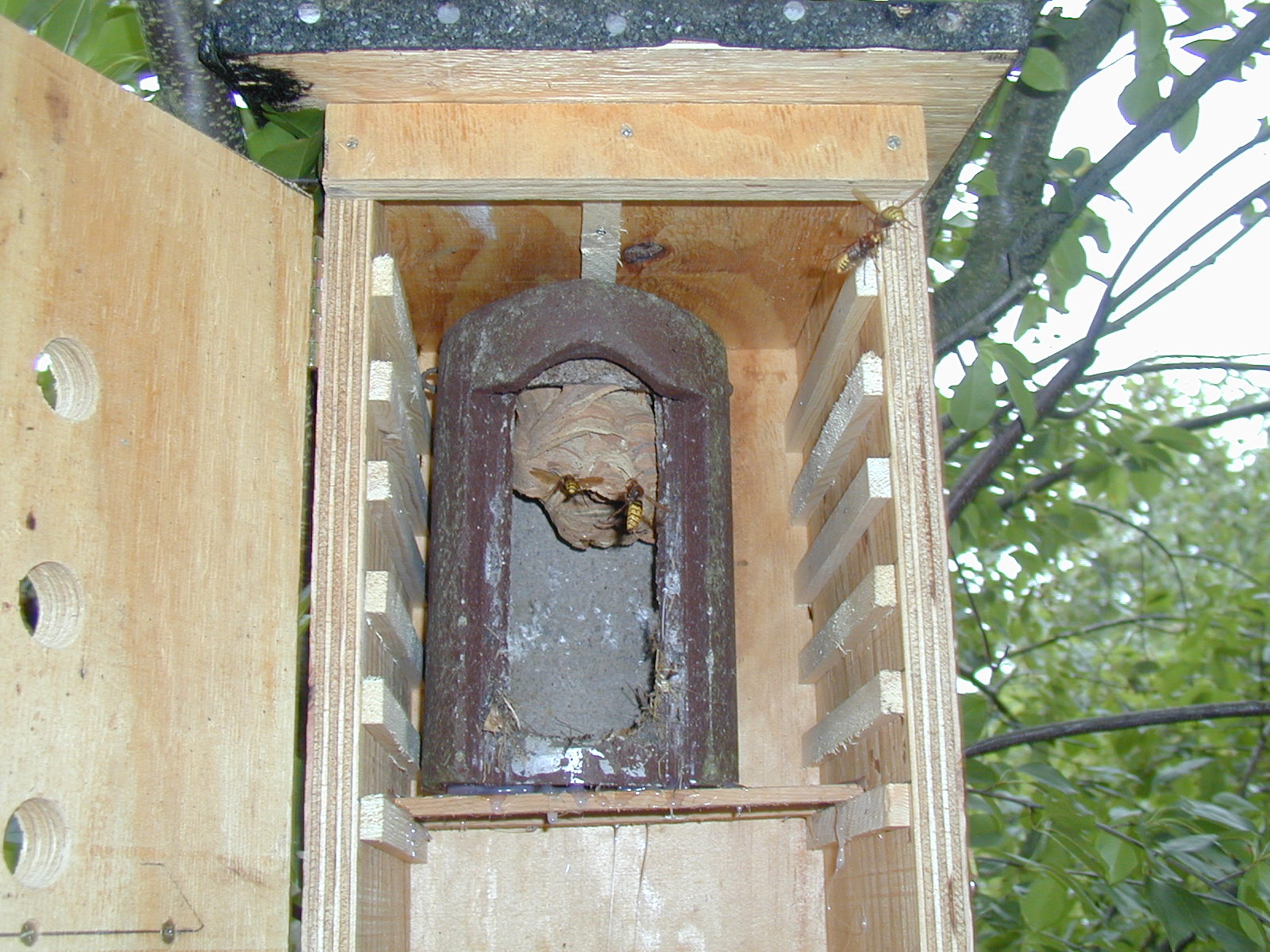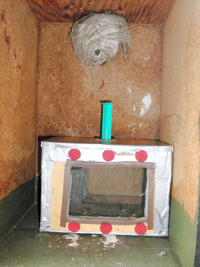Wespen- oder Hornissenvolkes in einen Umsiedlungsnistkasten eingebaut.