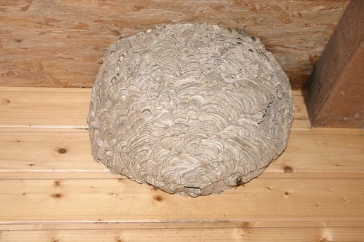 Nestgründung von Vespa velutina. Das Nest hing frei am Balken eines