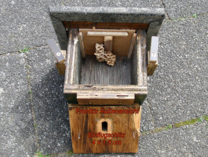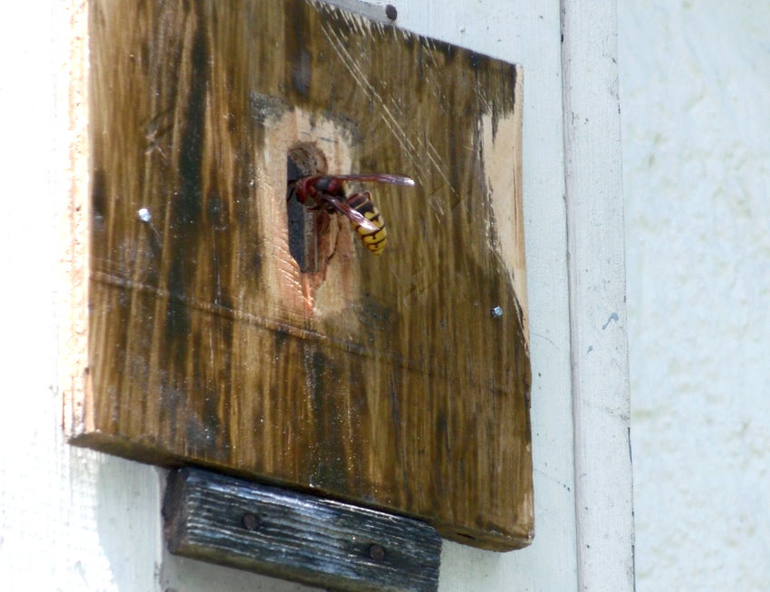 Einflug des Hornissenkastens befestigt. Das gibt der zurückkehrenden Königin
