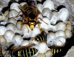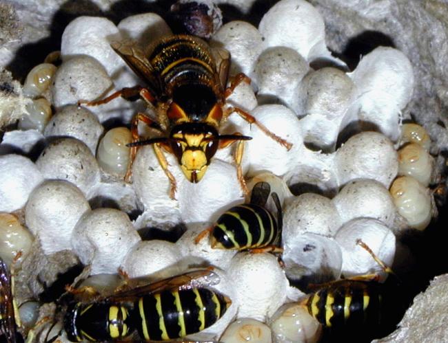 Verschiedene Ei, Larven- und Puppenstadien im Nest der gemeinen Wespe. |