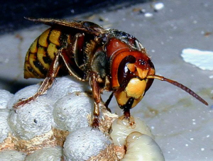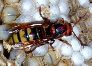 Hornissenkönigin auf verdeckelten Wabenzellen |