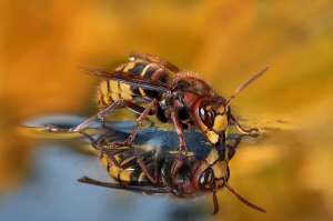 Wärmung: Bei geringen Außentemperaturen wird die optimale Nestinnentemperatur von etwa 30° Celsius +/- 2,5°C, durch zittern der Brustmuskulatur (ähnlich dem Zittern beim Menschen, wenn er friert) erzeugt. Hierzu legt sich z.B. die Königin in der Nestgründungsphase um den angelegten Wabenstiel flach auf die Wabe, um somit effektiv Wärme an die einzelnen Zellen weiter zu geben. Bei drohender Unterkühlung sind die Larven durch besondere Bewegungen oder Rotationen und die Puppen durch Abgabe von Duftstoffen befähigt, die Arbeiterinnen im Nest zu einer Erwärmung zu veranlassen. |