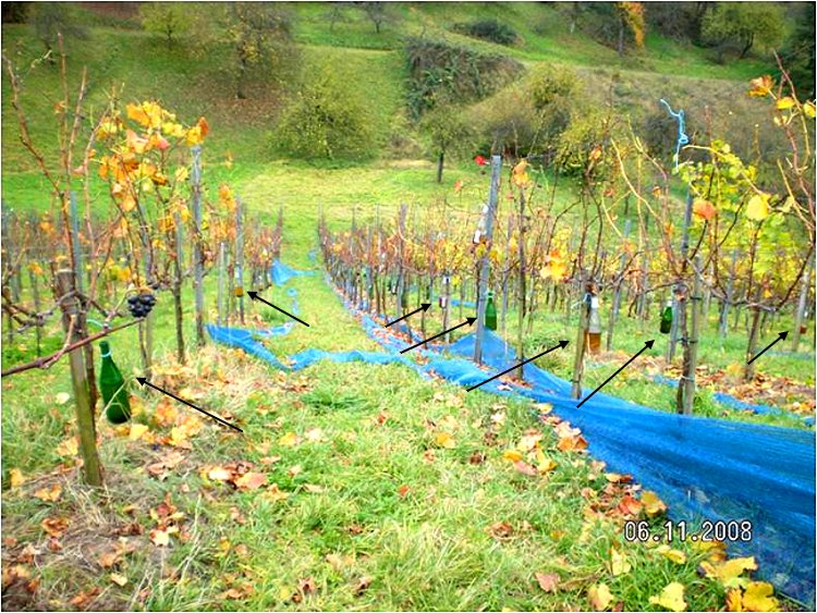 Flaschen mit einem Lockmittelgebräu befüllt und in der Rebanlage